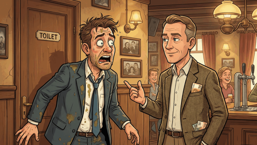 Hij staat op van zijn barkruk en wankelt richting de wc.