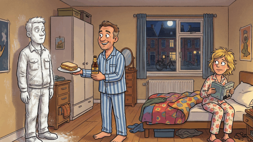 Rond een uur of twee ’s nachts wordt hij wakker. Hij staat op, loopt naar de keuken, pakt een flesje bier uit de koelkast en smeert een paar boterhammen met kaas. Met het bier en de boterhammen loopt hij terug naar de slaapkamer.