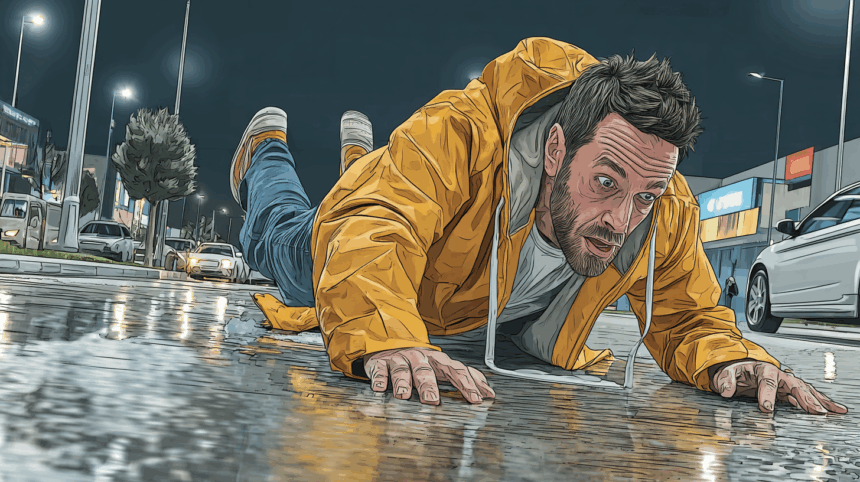 Met een enorme smak landt hij plat op het natte asfalt. Zijn neus schraapt bijna door het grind.