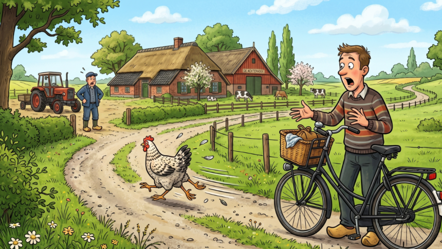 Een man fietst over een rustig landweggetje ergens in de Achterhoek, als er ineens een kip met drie poten langs hem heen sprint.