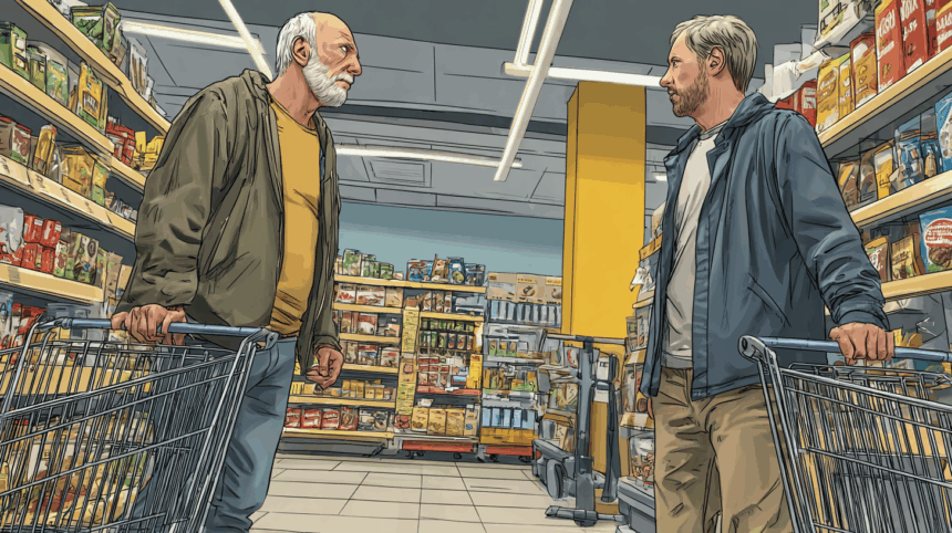 Twee mannen botsen met hun winkelwagens in de supermarkt.