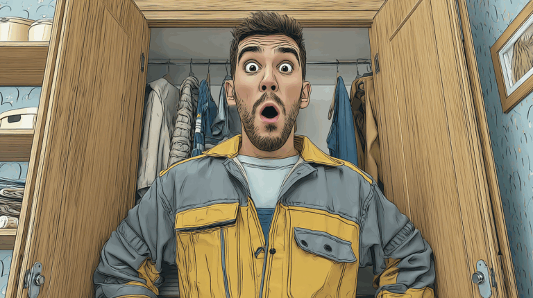 Een vrouw koopt een nieuwe kledingkast voor in de slaapkamer.Alles lijkt prima… totdat er een trein langsrijdt op het spoor achter hun huis. Boem, de hele kast valt om. Ze belt een monteur. Die zet extra steunen, draait alles muurvast — maar zodra er weer een trein voorbij dendert, valt de kast opnieuw om. Vastberaden … Meer lezen over Monteur betrapt in kledingkast tijdens bizarre kaststoring
