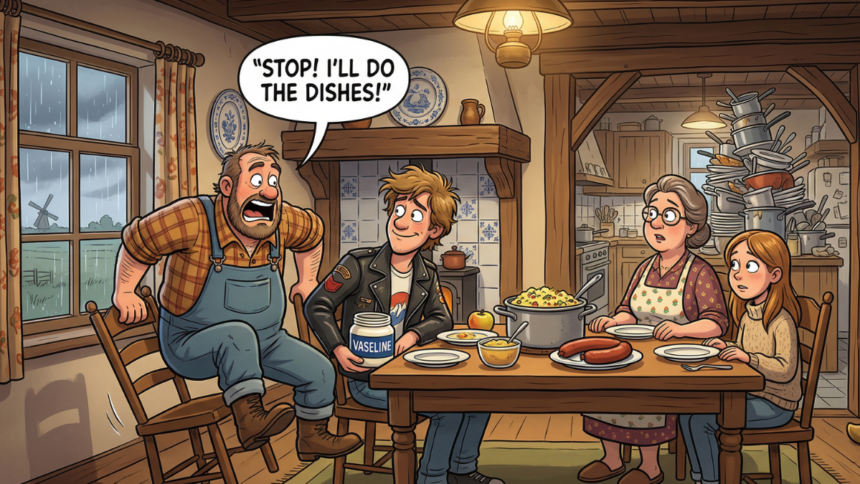 Dus hij begint charmant te doen tegen de dochter van de boer. De boer kijkt argwanend, maar zegt niets. Daarna maakt de jongen ook nog een paar veel te zoete complimenten aan de boerin. De sfeer aan tafel wordt steeds ongemakkelijker, maar nog steeds zegt niemand iets.