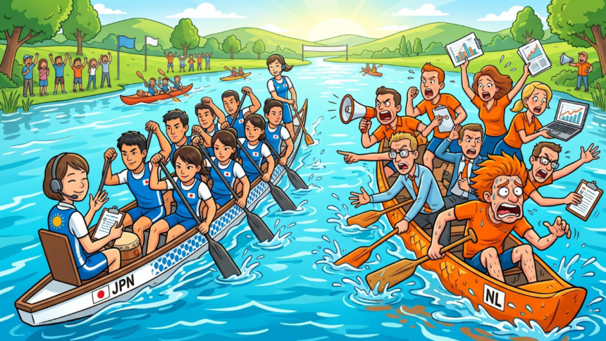 Het Nederlandse team baalt enorm. Het management besluit dat dit nóóit meer mag gebeuren en zet een onderzoek op. Na grondige analyse blijkt: bij de Japanners roeien 7 mensen en stuurt 1 persoon aan… terwijl bij de Nederlanders 7 mensen aanwijzingen geven en er maar 1 roeit.