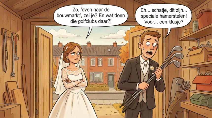 “Jan, ik zat te denken… nu we getrouwd zijn, is het misschien tijd dat je stopt met golfen. Je staat elk weekend op de baan. Je kunt die clubs vast nog goed verkopen.”