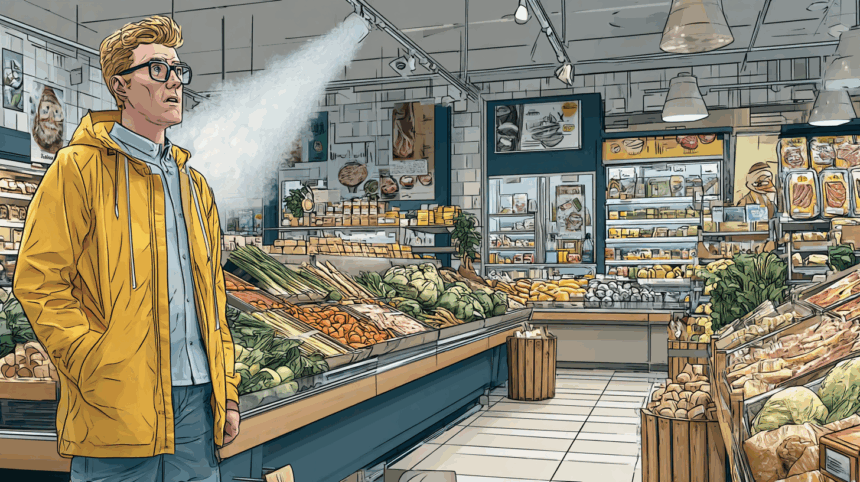 Ze hebben daar een automatisch watersproeisysteem om de groente en het fruit vers te houden. Net voordat het aangaat, hoor je zacht onweer en ruik je de geur van regen.