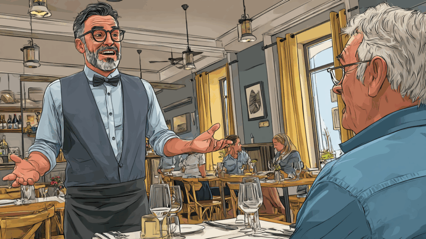 De ober glimlacht en zegt: