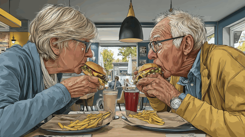 De oude man pakte de hamburger uit, sneed hem netjes doormidden en schoof één helft naar zijn vrouw toe.
