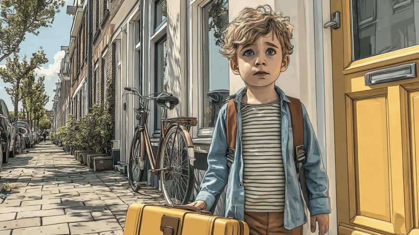 De volgende dag ziet zijn vader kleine Patrick de voordeur uitlopen met een koffertje in zijn hand.