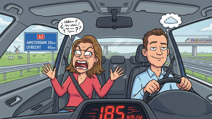 Een getrouwd stel rijdt over de A2 richting Utrecht. De man zit achter het stuur, 120 km/u op de teller.