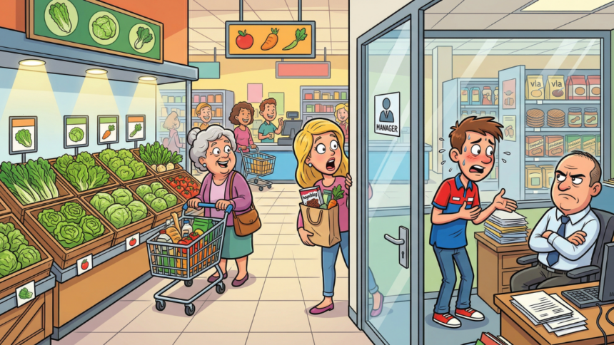 De jonge vakkenvuller kijkt hem verbaasd aan en zegt: