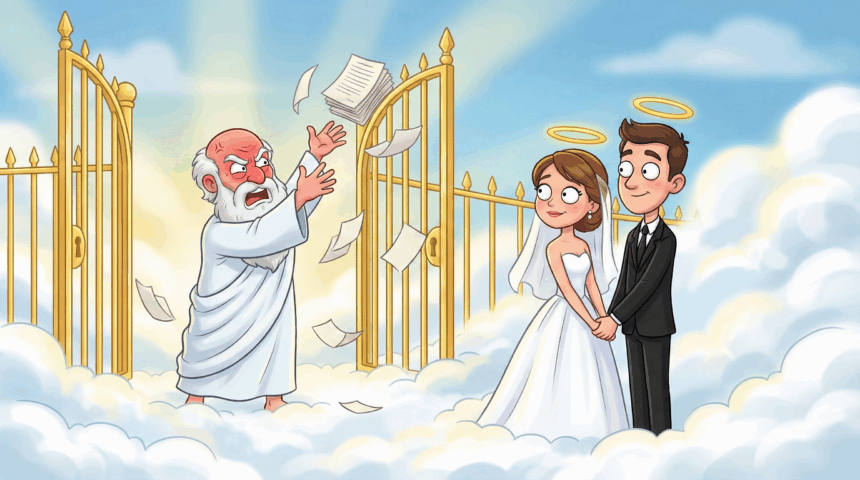 “Maar eh… stel dat het niet werkt… kunnen we dan ook scheiden in de hemel?”