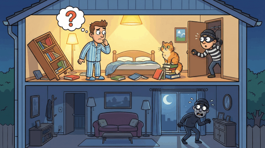 Even later gaat de tweede amateur-inbreker naar boven. Maar hij stoot een hele boekenkast om, die met oorverdovend lawaai instort. In paniek verstopt hij zich in de kast. De bewoner stormt de kamer binnen en roept: