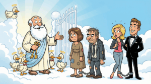 Twee Nederlandse vrouwen overlijden en komen samen bij de hemelpoort. Daar staat Petrus ze al op te wachten.Hij zegt:“Welkom in de hemel. Jullie mogen hier alles doen wat je wilt, één regel alleen: trap niet op een eend. Die maken hier een enorm kabaal.” De vrouwen beloven voorzichtig te zijn en lopen de hemel binnen. … Meer lezen over Twee vrouwen in de hemel
