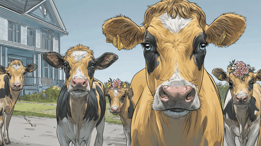 Op een boerderij lopen vijf koeien: één moederkoe en vier kalfjes. Het eerste kalfje vraagt: