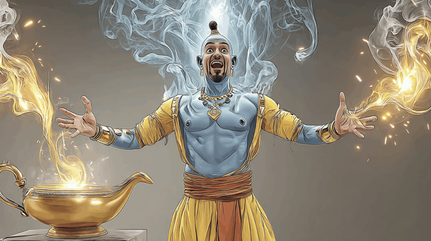 Een man vindt op zolder een oude toverlamp. Uit nieuwsgierigheid wrijft hij erover, en POEF! – in een wolk rook verschijnt een genie.