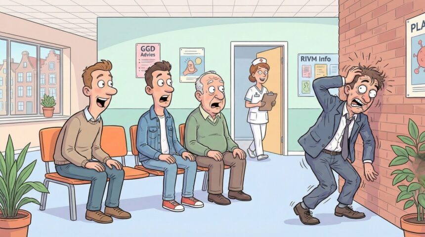 Vier mannen zitten in de wachtruimte van een Nederlands ziekenhuis, omdat hun vrouwen aan het bevallen zijn.