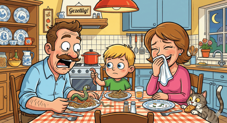 Tijdens het avondeten zat een Nederlands gezin gezellig aan tafel. Vader had net een groot bord dampende noedels voor zich staan, moeder schepte rustig op en de kinderen zaten al ongeduldig te eten.