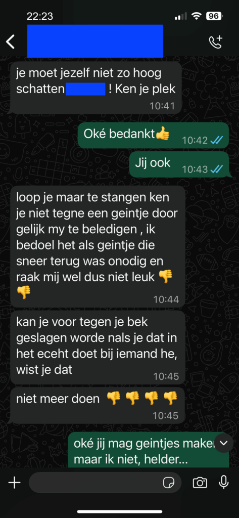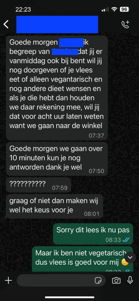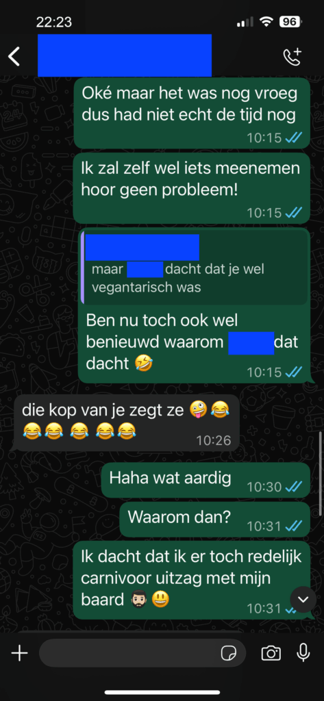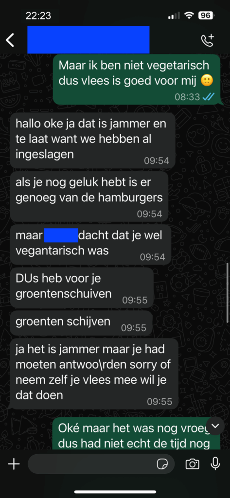 Toen de laat reagerende deelnemer aangaf dat het jammer was dat hij geen vlees kreeg, volgde een speelse opmerking van een ander groepslid. Deze opmerking werd echter niet goed ontvangen en mondde uit in wederzijdse verwijten. Waar de één het als een grap bedoelde, ervoer de ander het als een persoonlijke belediging. Dit zorgde voor een gespannen sfeer in de chat, waarbij zelfs waarschuwingen over ‘in het echt zoiets zeggen’ werden gemaakt.