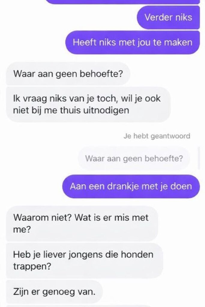 Het meest opvallende moment volgt wanneer de man een morele kaart trekt. “In plaats met iemand drankjes doen die zoveel dieren heeft gered en dan wel met een of andere gast afspreken die 0 gevoel heeft met dieren?” schrijft hij. Daarmee probeert hij haar keuze te framen als iets verkeerds. Uiteindelijk lijkt hij zelf te beseffen dat het te ver gaat: “Oke zo kwam het over.” De vrouw reageert met excuses die eigenlijk niet nodig zijn: “Nee sorry vind het vervelend als dat zo overkwam. Ik heb er gewoon geen behoefte aan. Verder niks.” Het incident laat zien hoe online daten soms ontspoort zodra iemand een afwijzing persoonlijk opvat.
