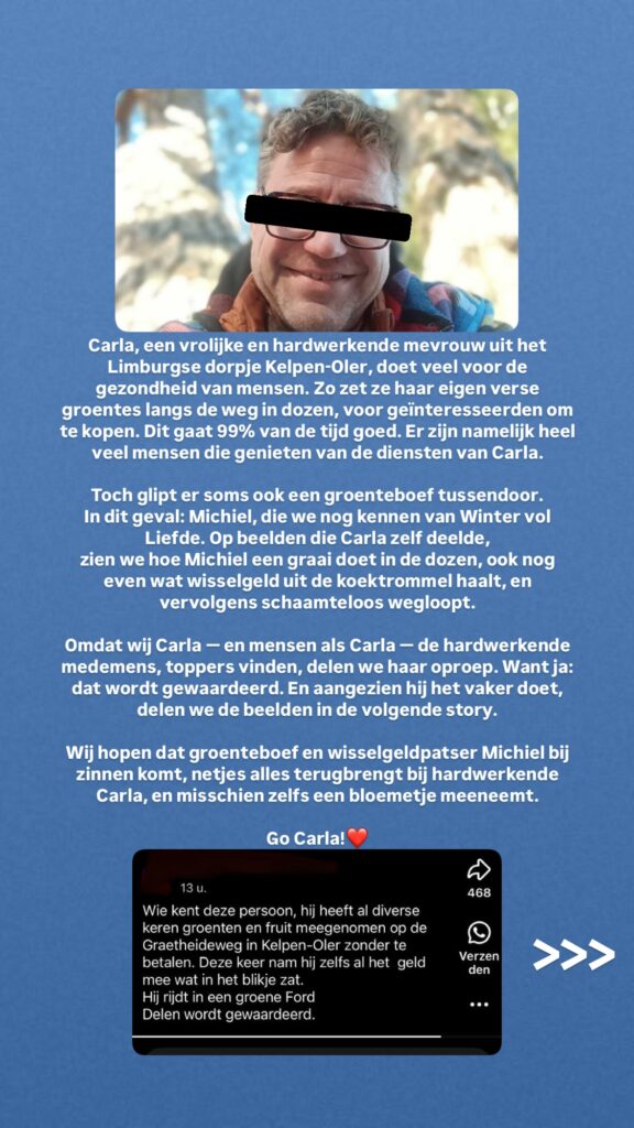 Hoewel er vooralsnog geen juridische stappen zijn aangekondigd, heeft de situatie in Kelpen-Oler de gemoederen flink beziggehouden. Dorpsgenoten steunen Carla massaal en prijzen haar openheid. “Zo iemand moet aangesproken worden”, schrijft een buurtbewoner op Facebook. Anderen roepen Michiel op om de spullen terug te brengen en excuses aan te bieden.