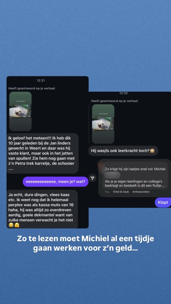 Na het delen van de video stroomden ook privéberichten binnen bij Reality_fbi. Een oud-caissière uit Weert vertelde dat ze Michiel jaren geleden al betrapte op het niet betalen van vlees en kaas bij supermarkt Jan Linders. Hij zou volgens haar “overdreven vriendelijk” zijn geweest, wat achteraf volgens haar diende als een slimme dekmantel.