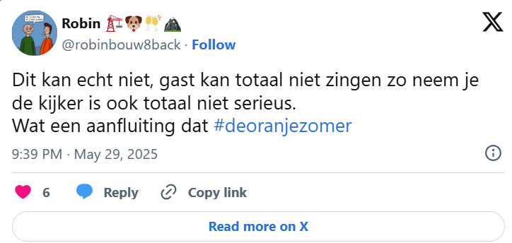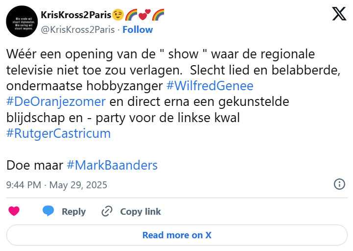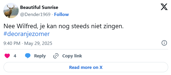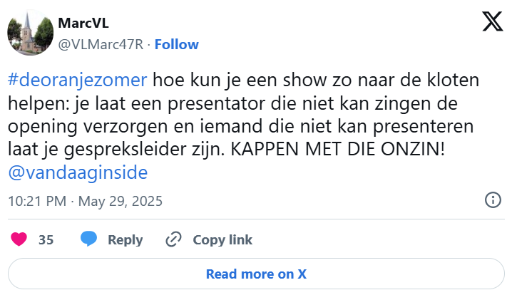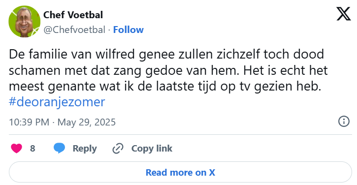 Wilfred Genee, zorgde woensdagavond voor gefronste wenkbrauwen tijdens De Oranjezomer,met zijn opvallende muzikale opening. In plaats van een scherpe aftrap van het programma koos Genee ervoor om Zoek Jezelf Broeder te zingen, een nummer van Van Kooten en De Bie. De uitvoering riep echter vooral plaatsvervangende schaamte op bij de kijkers. Ondanks de luchtige opzet van deze ‘zomerhit’, werd de performance massaal afgekeurd. Het optreden was volgens velen pijnlijk, geforceerd en totaal misplaatst in het format van De Oranjezomer.