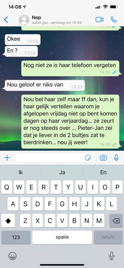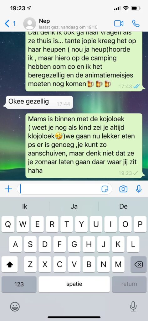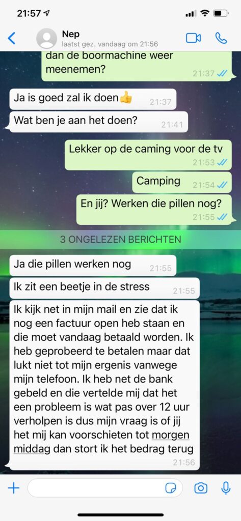 De nepzoon vraagt doodleuk of hij de boormachine weer moet meenemen, informeert naar pillen die nog zouden werken en krijgt complete updates over het dagelijks leven voorgeschoteld. De vader vertelt relaxed dat hij “lekker op de camping voor de tv” zit en strooit ondertussen met details over familie, stress en rekeningen. De Whatsapp oplichter lijkt alles serieus te nemen en haakt nergens af.