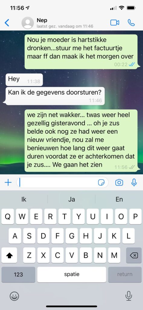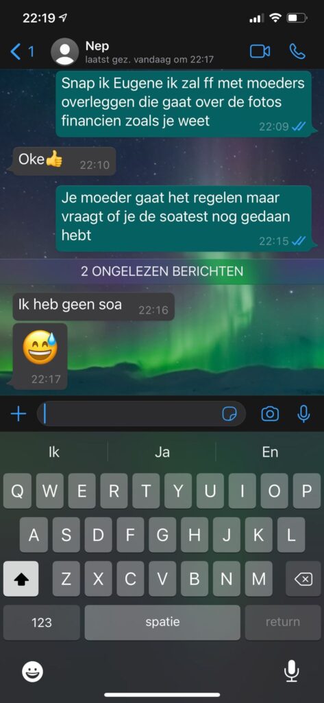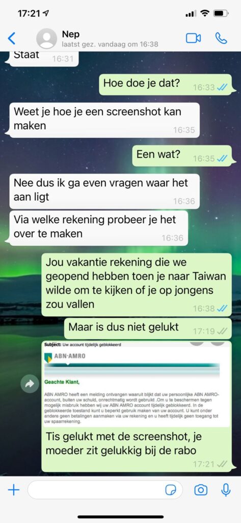 Wanneer het gesprek richting geld gaat, wordt het pas echt genieten. De vader blijft beleefd, schuift beslissingen door naar “moeders die over de financiën gaat” en praat vrolijk verder over zussen, vriendjes en soa-tests. De Whatsapp oplichter blijft geduldig wachten, niet doorhebbend dat hij al dagenlang keihard in de maling wordt genomen.