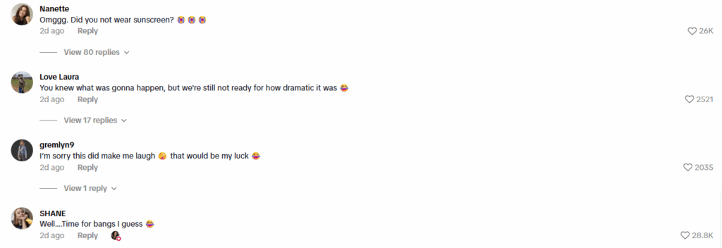 TikTok stond op z’n kop. De video werd massaal gedeeld en de comments stroomden binnen. Van “Girl, time for bangs!” tot “Dit zou mij ook gebeuren” – mensen konden zich er óf helemaal in vinden, óf waren compleet verbijsterd dat iemand zo lang in de zon kon staan zonder bescherming.