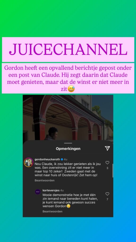 Het moment werd razendsnel opgepikt door onder andere JuiceChannel, dat bekendstaat om het uitlichten van spraakmakende momenten op social media. Zij plaatsten een screenshot van de opmerking van Gordon en voegden er weinig verhullend aan toe: “Gordon gunt het Claude blijkbaar niet…”