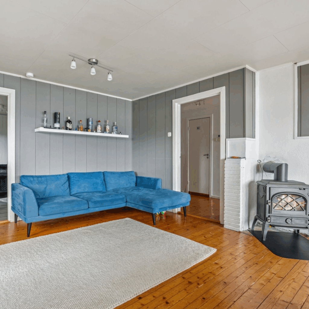 Het huis in Noorwegen is verdeeld over twee woonlagen en biedt flexibele leefruimtes die eenvoudig aan te passen zijn aan persoonlijke wensen. Denk aan extra slaapkamers, een thuiskantoor, hobbyruimte of juist een grote leefkeuken met uitzicht. De indeling is praktisch en biedt volop potentie voor wie stap voor stap een woning naar eigen smaak wil vormgeven.