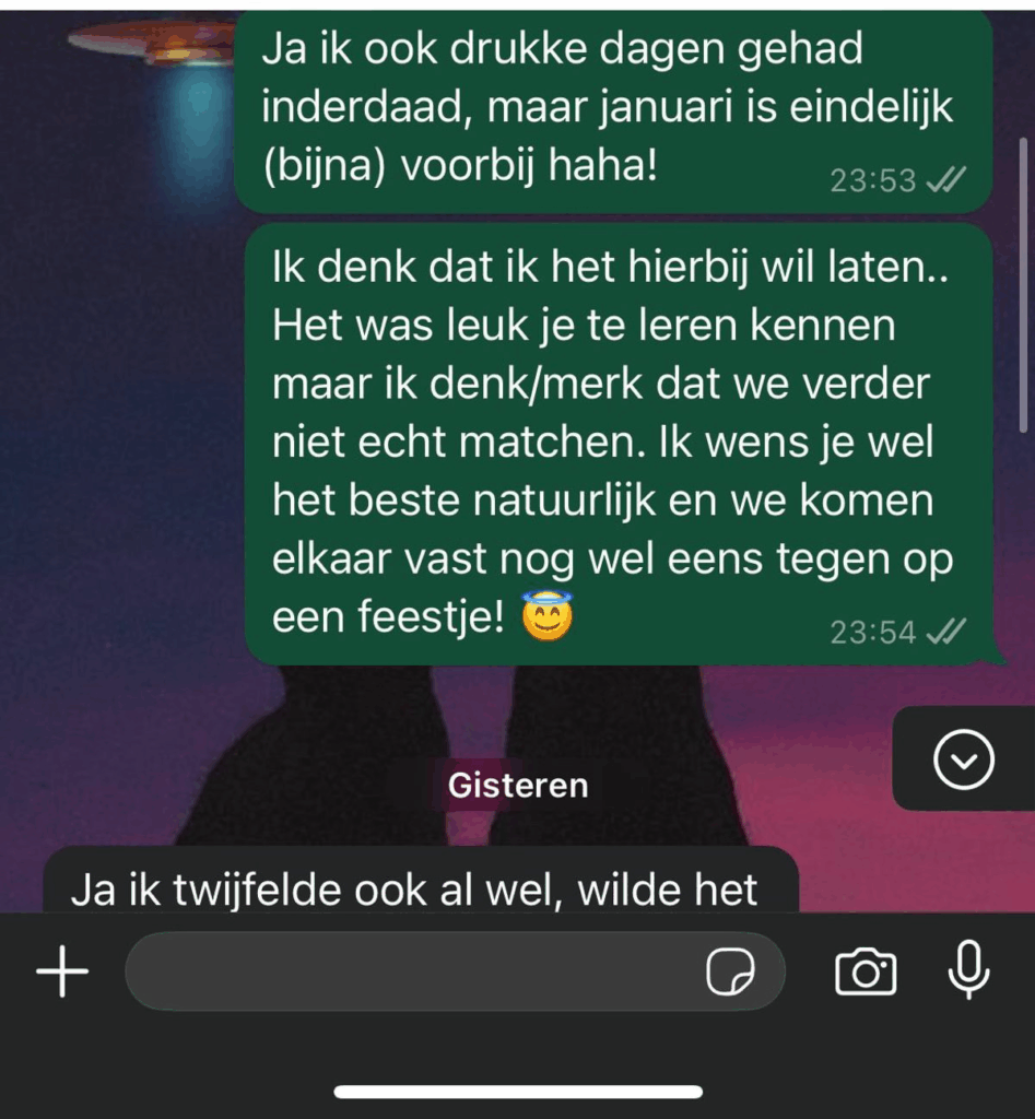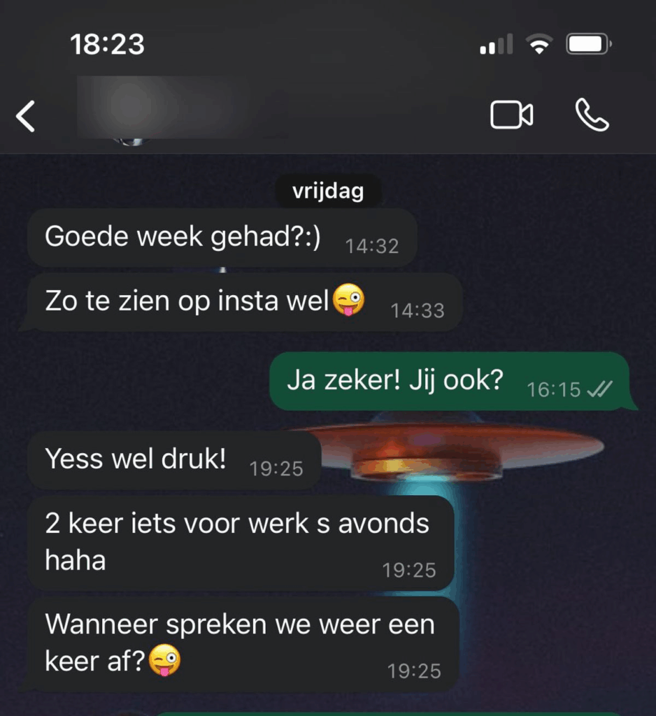 Het leek allemaal zo leuk. In de eerste gesprekken vroeg de man enthousiast: “Goede week gehad?:)” waarop zij antwoordde dat het zeker een fijne week was geweest. Er volgde luchtig gechat over werk en sociale bezigheden. Zo schreef hij: “2 keer iets voor werk s avonds haha.” Vervolgens stelde hij al snel voor: “Wanneer spreken we weer een keer af?” Een duidelijk teken dat deze tinderdate hoopvol was over een vervolg. Toch bleek er onderhuids al wat twijfel te broeien. Want hoewel het contact soepel verliep, was er nog geen echte klik. En bij een tinderdate draait het daar natuurlijk wel om.