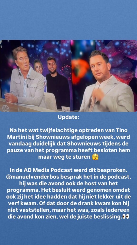 Wat ook opviel: Het Tino Martin Shownieuws-optreden begon al stroef. Volgens presentator Manuel Venderbos was de zanger vooraf al nerveus. Hij kwam moeilijk uit zijn woorden, sprak vaag en leek afwezig tijdens discussies aan tafel. Bij het onderwerp Songfestival raakte hij compleet de draad kwijt.