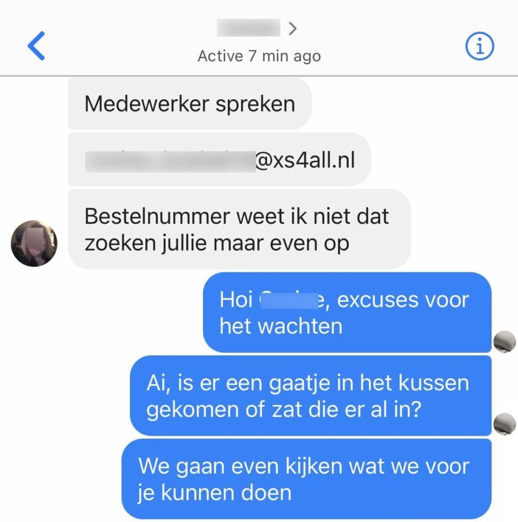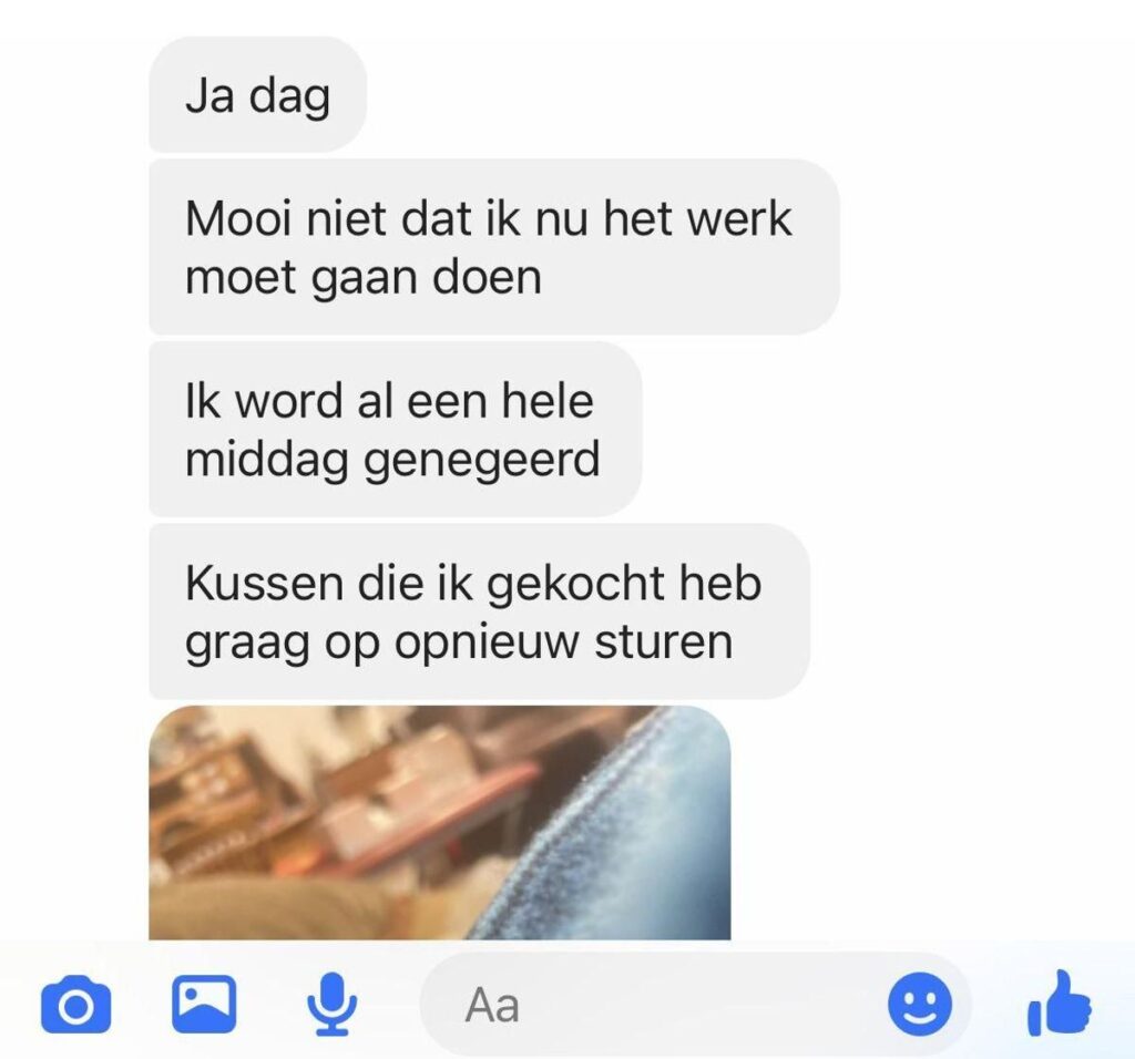 In de chat van klantenservice begon het al direct met een harde binnenkomer. De klant vond dat haar klacht via het contactformulier compleet genegeerd was. In plaats van rustig haar ordergegevens door te geven, gooide ze er gefrustreerd uit: “Ja dag, mooi niet dat ik nu het werk moet doen.” Terwijl de automatische assistent netjes vroeg om ordernummer en e-mailadres, bleven de berichten van haar kant steeds feller en dwingender. Ze eiste dat het kapotte kussentje opnieuw zou worden opgestuurd en klaagde dat ze al de hele middag werd genegeerd.