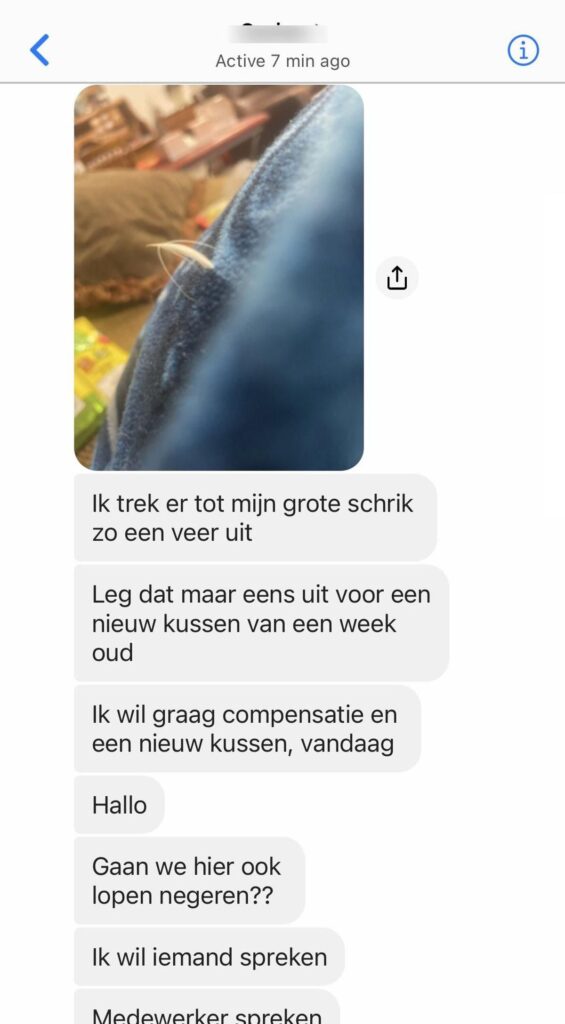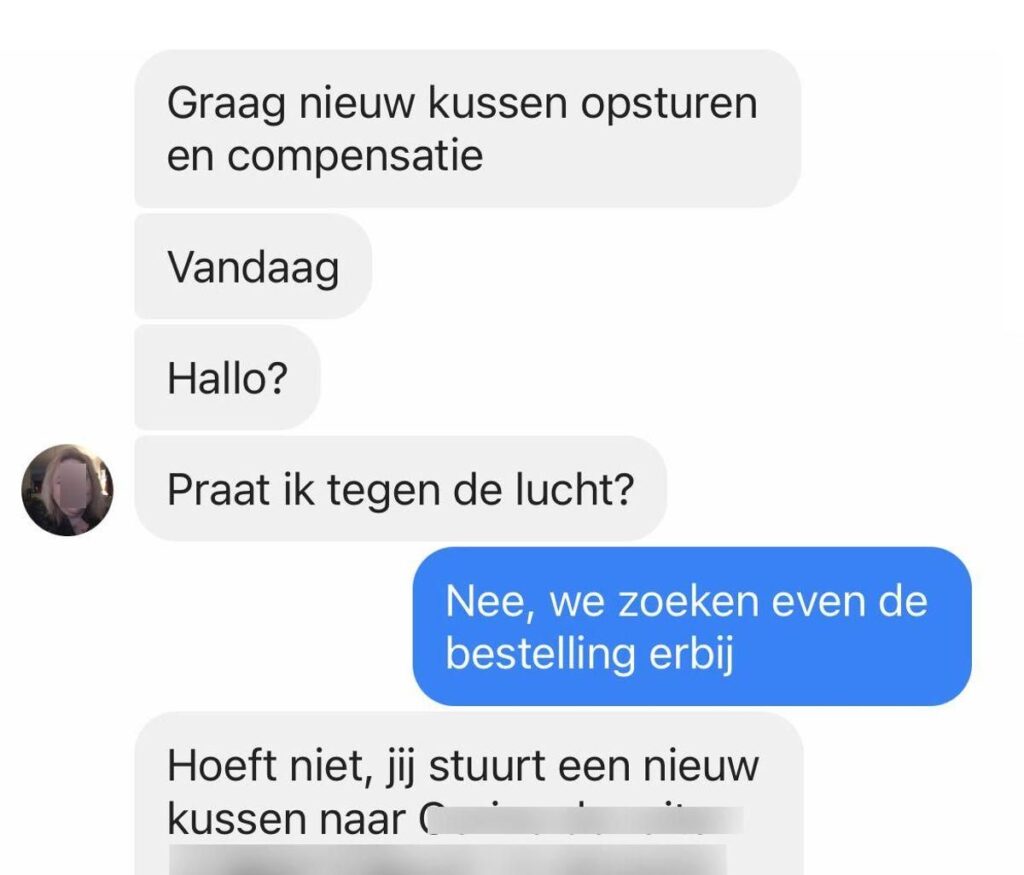 Na veel heen en weer getyp kwam er dan eindelijk een oplossing in de chat van klantenservice. De medewerker bevestigde dat een nieuw kussen maandag zou worden verstuurd. Het zou dinsdag in huis zijn. Daarbij kreeg de klant ook nog eens een kortingscode als compensatie. Toch was dit voor haar niet genoeg. Ze wilde dat het pakket diezelfde dag nog de deur uitging.