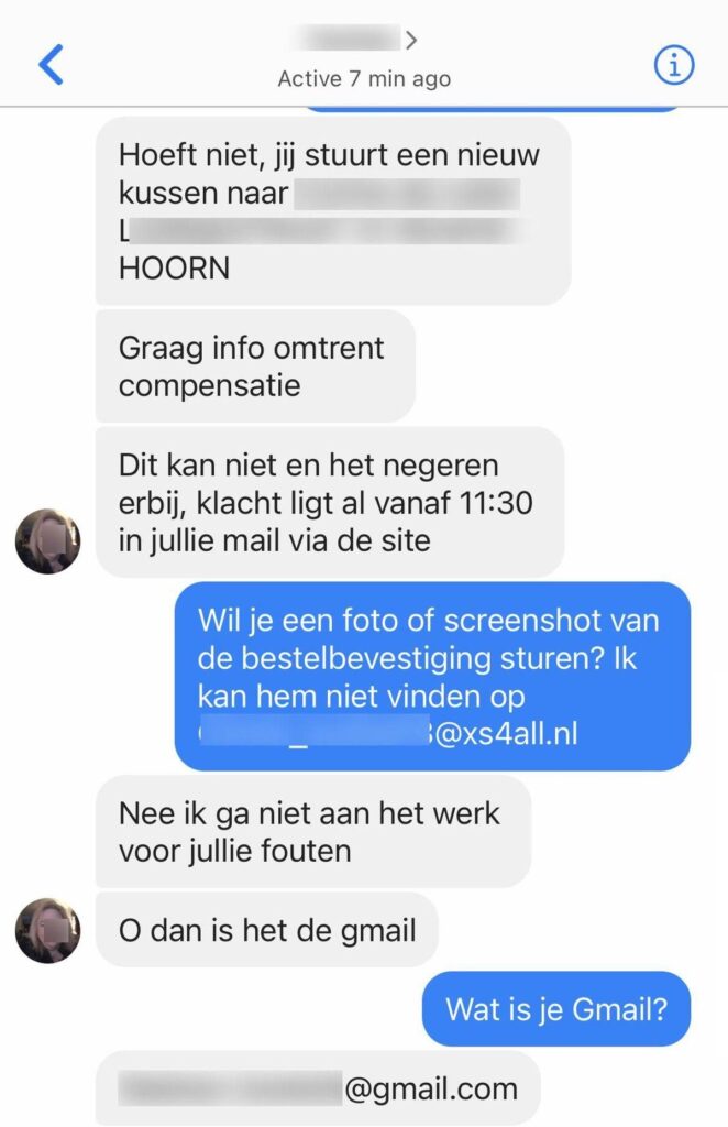 De chat van klantenservice liep al snel uit de hand. De klant eiste niet alleen een nieuw product, maar óók compensatie. Haar toon werd steeds dwingender, met berichten als: “Praat ik tegen de lucht?” en “Dit kan niet, klacht ligt al vanaf 11:30 bij jullie.” Toen de medewerker om een foto van de bestelbevestiging vroeg, weigerde ze resoluut: “Nee, ik ga niet aan het werk voor jullie fouten.” Uiteindelijk gaf ze met tegenzin een ander e-mailadres door. Hierdoor kon de medewerker haar bestelling vinden.