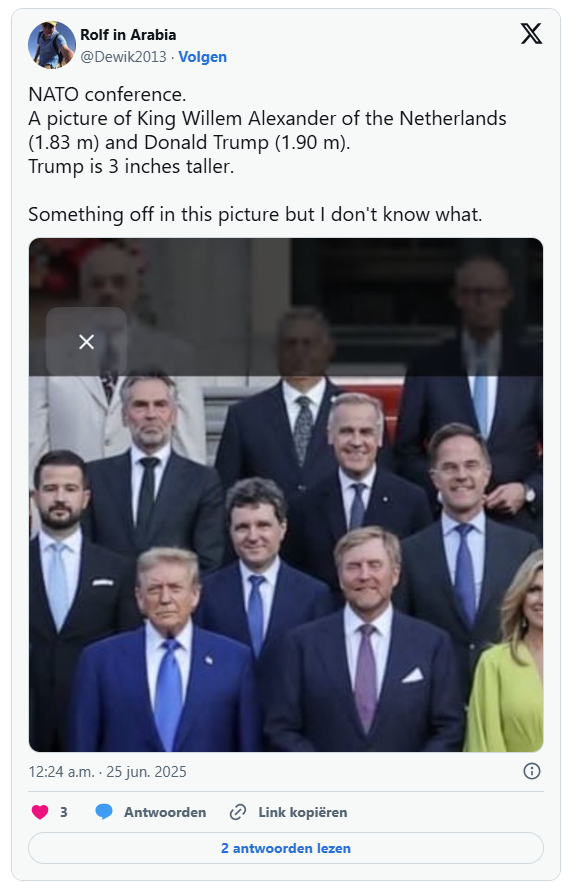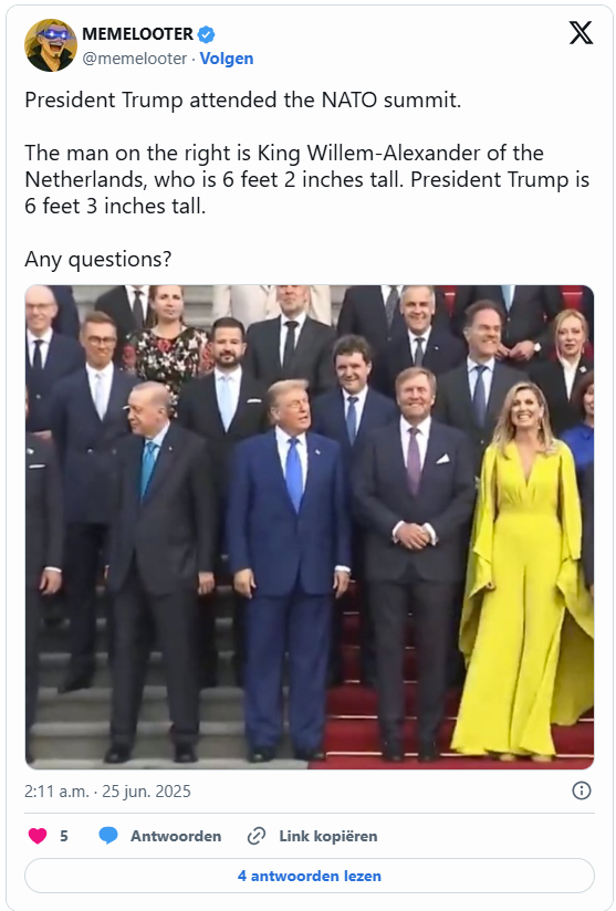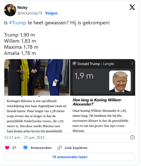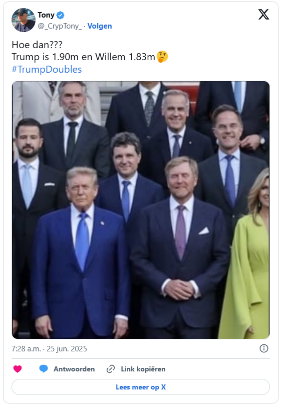 De combinatie van die opvallende foto’s, het verschil in postuur en Trumps eigen claim over zijn lengte, zorgde voor een social media-explosie. Onder de hashtag #HoeDan staken mensen de draak met de situatie. “Trump is 1,90 meter en Willem 1,83. Hoe dan?!” schreef iemand onder een groepsfoto van de NAVO-top, waar Trump zichtbaar kleiner lijkt.