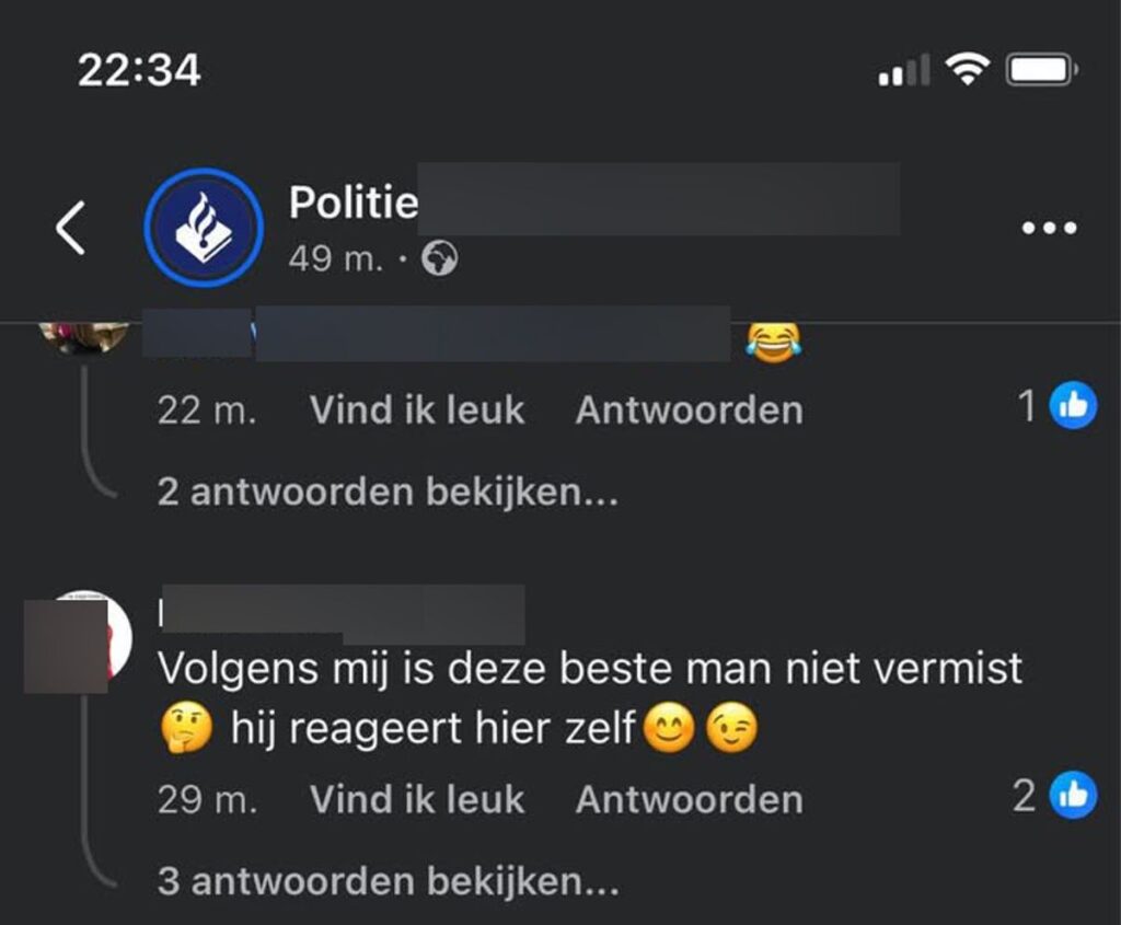 Onder het originele opsporingsbericht van politie verschenen reacties die suggereerden dat de man zelf actief was op sociale media. Kort daarna reageerde hij zelf fel: “Ik ben niet vermist, stelletje achterlijke!” Hij beschuldigde de politie ervan onterecht zijn deur te hebben beschadigd en zijn hond onnodig op te jagen. Ook liet hij weten dat hij bewust niet opendeed omdat hij zich ergerde aan de manier van benaderen. De uitspraak “stelletje idioten” trok daarbij volop aandacht. Dit leidde tot verdeeldheid onder reageerders. Het opsporingsbericht van politie lijkt hierdoor zijn doel voorbij te zijn geschoten. Veel mensen vroegen zich af hoe het mogelijk was dat de man als vermist kon worden opgegeven. Hij was blijkbaar bereikbaar. Ook riep het incident vragen op over de communicatie tussen burgers en politie.