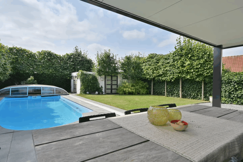 Een villa in België kopen betekent vaak ook genieten van veel buitenruimte. Deze woning beschikt over een volledig omheinde tuin met elektrische toegangspoort, overdekt terras en een verwarmd buitenzwembad. Dankzij volwassen groen is privacy gegarandeerd. Ook is er een tuinhuis met warmtepomp en zwembadinstallatie aanwezig.