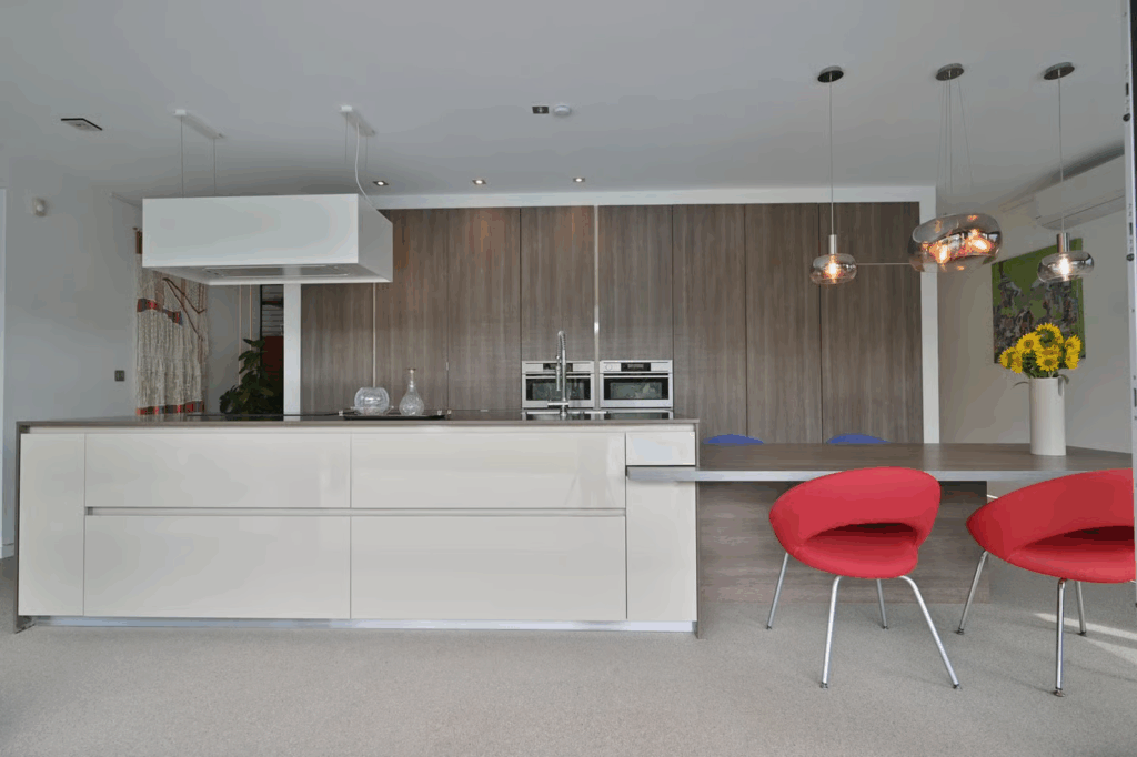 De woning biedt 214 m² woonoppervlak op een perceel van 521 m². Grote raampartijen zorgen ervoor dat de leefruimte baadt in natuurlijk licht en het contact met de tuin maximaal wordt benut. De begane grond beschikt over een royale woonkamer met bureauhoek en een open leefkeuken voorzien van topapparatuur, waaronder een inductiekookplaat, stoomoven en combioven.