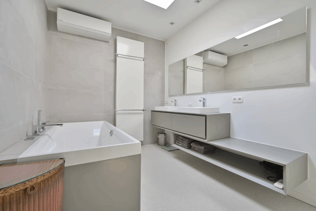 Op de verdieping vind je drie slaapkamers, waarvan één met dressing en een luxe badkamer met ligbad en inloopdouche. Een tweede badkamer biedt extra comfort voor gezinnen of gasten.