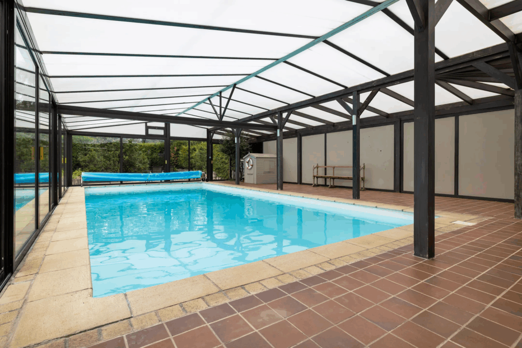 Het absolute pronkstuk? De ruimte met binnenzwembad van maar liefst 160 m²! Dankzij meerdere schuifpuien stroomt het daglicht rijkelijk naar binnen en loopt binnen moeiteloos over in buiten. Perfect voor ontspanning, feestjes of gewoon een moment van rust.