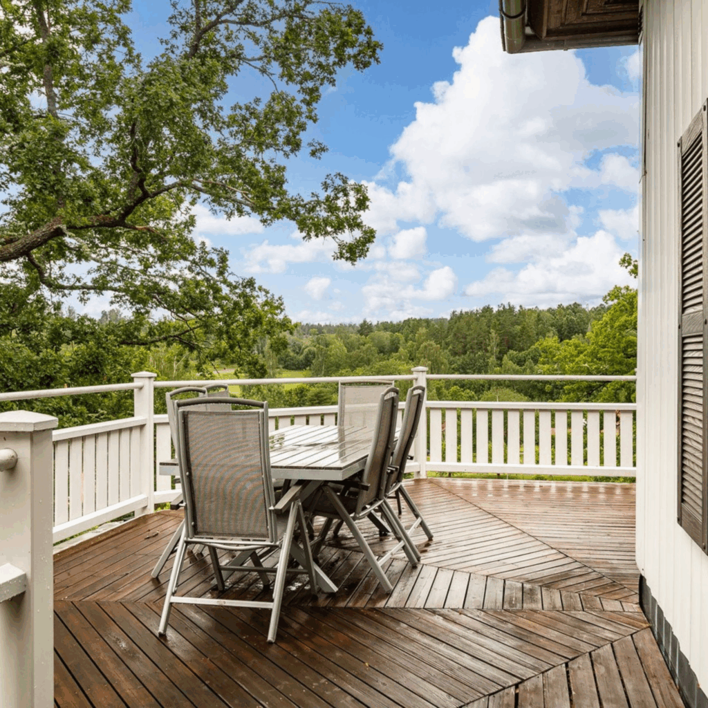 De verhoogde veranda is een van de absolute blikvangers van deze villa in Zweden. Vanaf het houten terras kijk je uit over uitgestrekte bossen en weilanden. Of je nu buiten dineert, leest of gewoon van de stilte geniet, de buitenruimte nodigt uit tot ontspanning. Ook de tuin biedt volop mogelijkheden, van tuinieren tot zonnen of gewoon dwalen richting het meer.