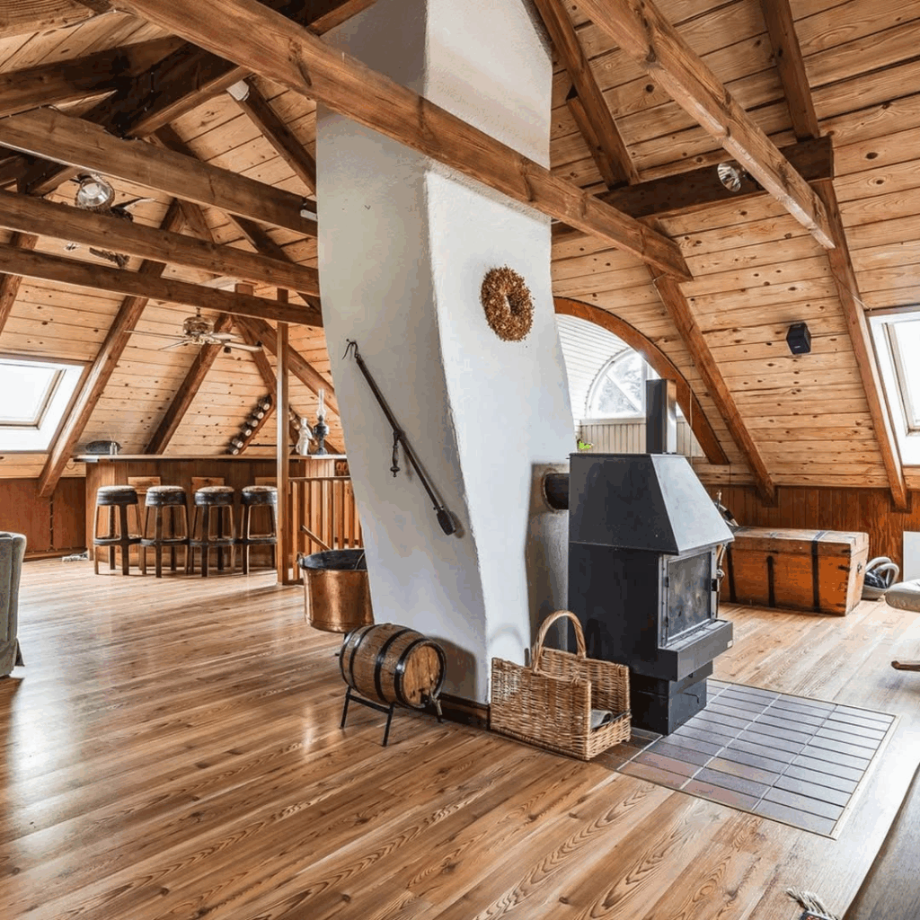 De woning beschikt over twee tot drie slaapkamers, verdeeld over drie sfeervolle verdiepingen. Grote ramen zorgen voor natuurlijk lichtinval en geven uitzicht op de groene omgeving. De houten accenten, knusse indeling en authentieke uitstraling geven het huis een warme, uitnodigende sfeer. Hier kom je thuis — echt thuis.
