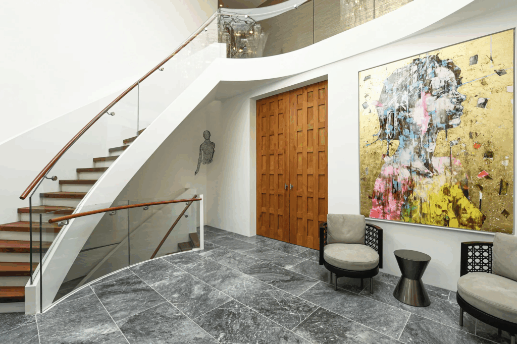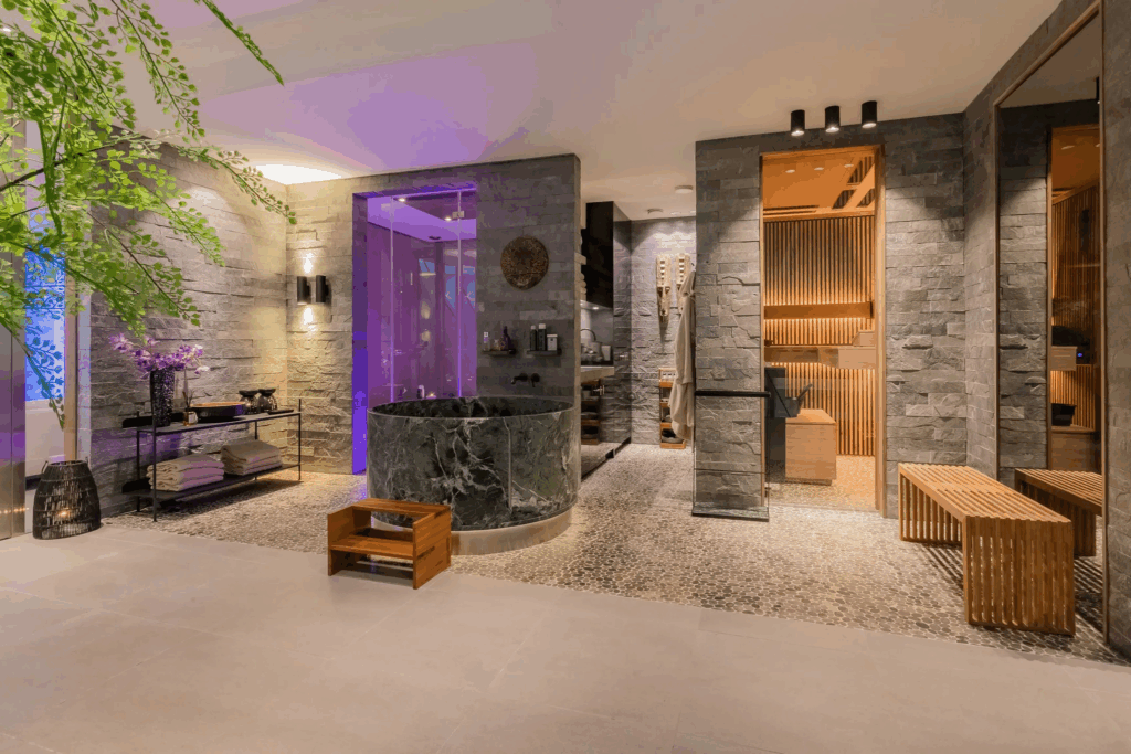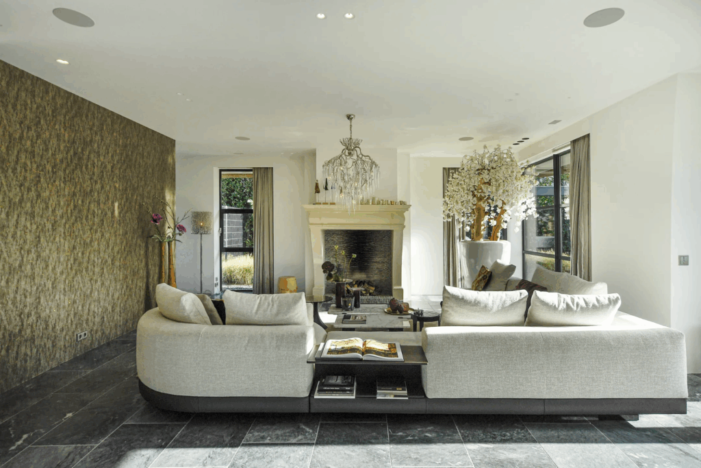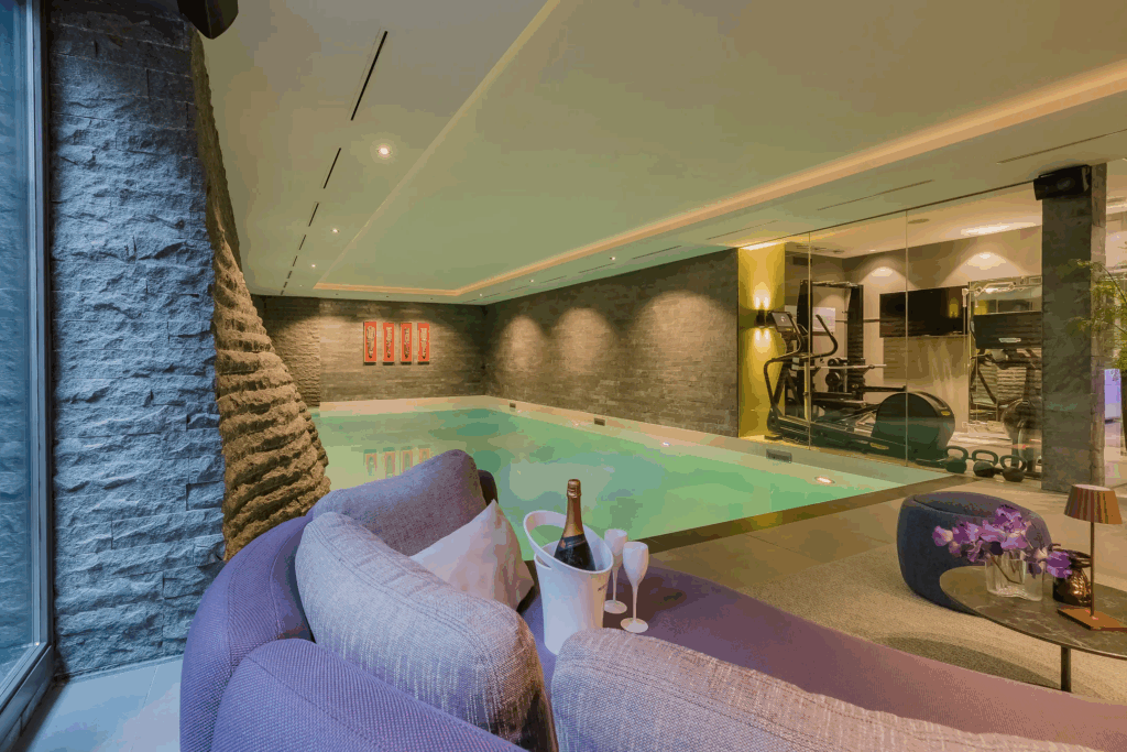 Misschien wel het meest indrukwekkende onderdeel van het huis is het souterrain. Hier vind je een 13 meter lang verwarmd binnenzwembad, sfeervol omlijst door golvende wanden en een verlichte waterval. Daarnaast biedt deze verdieping een fitnessruimte, bioscoop, stoomcabine én een Finse infraroodsauna. Het is het soort luxe dat je normaal alleen in exclusieve resorts aantreft – maar hier is het onderdeel van je dagelijkse leven.