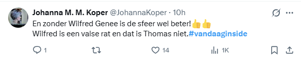 De uitzendingen van Vandaag Inside zonder Wilfred Genee hebben onverwacht veel losgemaakt. De tijdelijke inzet van Thomas van Groningen leidde tot volop discussie en positieve reacties van kijkers, die zelfs speculeren over blijvende veranderingen. Voorlopig blijft het bij speculatie, maar duidelijk is wel dat Vandaag Inside ook zonder Genee volop gesprekstof oplevert.