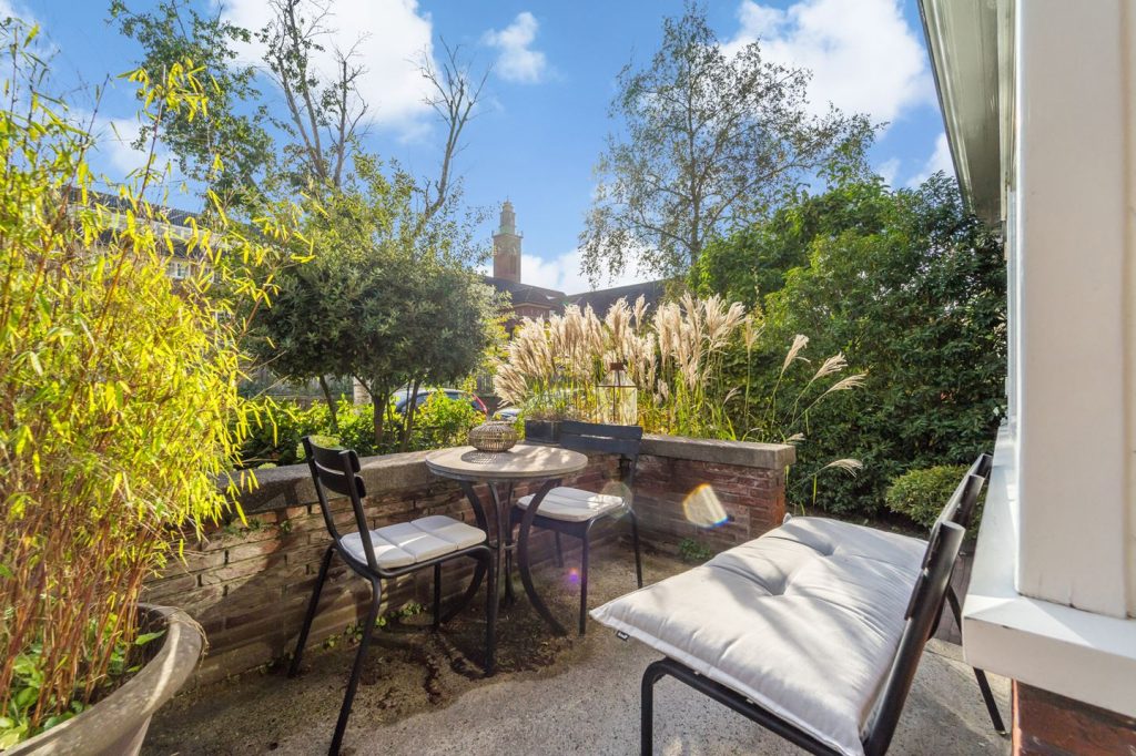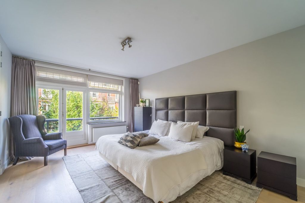 Op de eerste etage bevindt zich de hoofdslaapkamer met inbouwkasten en een ensuite badkamer met ligbad, wastafel en douche. Aan de achterzijde is er een balkon/terras over de gehele breedte van de woning. Er is tevens een apart toilet. Aan de voorzijde bevindt zich een grote lichte tweede slaap-/studeerkamer met pantry en een erker. Momenteel wordt de derde slaapkamer gebruikt als werkkamer. Op de tweede etage zijn er twee grote slaapkamers en een kleinere kamer. Op de overloop is er een kast met was/droogopstelling. Ook is er een moderne badkamer met ligbad, inloopdouche, wastafel en toilet. De derde etage biedt een slaapkamer met dakramen en airconditioning, en een aparte kast voor de CV-ketel en boiler. Er is veel bergruimte beschikbaar.
