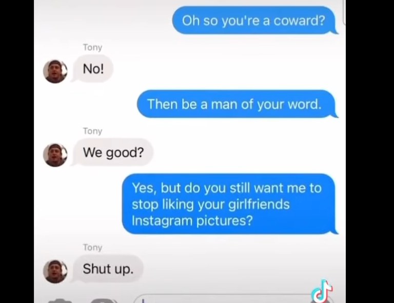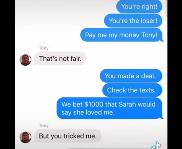 Het gesprek begint tamelijk standaard: Tony stuurt een bericht naar een onbekende gast met de waarschuwing om geen ‘likes’ meer te geven op de foto’s van zijn vriendin, Sarah, op Instagram. De onbekende gast, verbaasd en enigszins geamuseerd, kan alleen maar lachen om deze waarschuwing. Hij reageert luchtig door te zeggen dat Sarah evenveel, zo niet meer, van zijn posts houdt. Hij gaat zelfs zo ver door een weddenschap voor te stellen van 1000 dollar, bewerend dat Sarah meer van hem houdt dan van Tony. De spanning stijgt als de onbekende gast Tony uitdaagt voor de weddenschap. Tony, vol vertrouwen en duidelijk geprikkeld, gaat de uitdaging aan. Beiden wachten in spanning op Sarah’s reactie, waarbij de onbekende gast grappend voorstelt om het bewijs via WhatsApp te leveren.