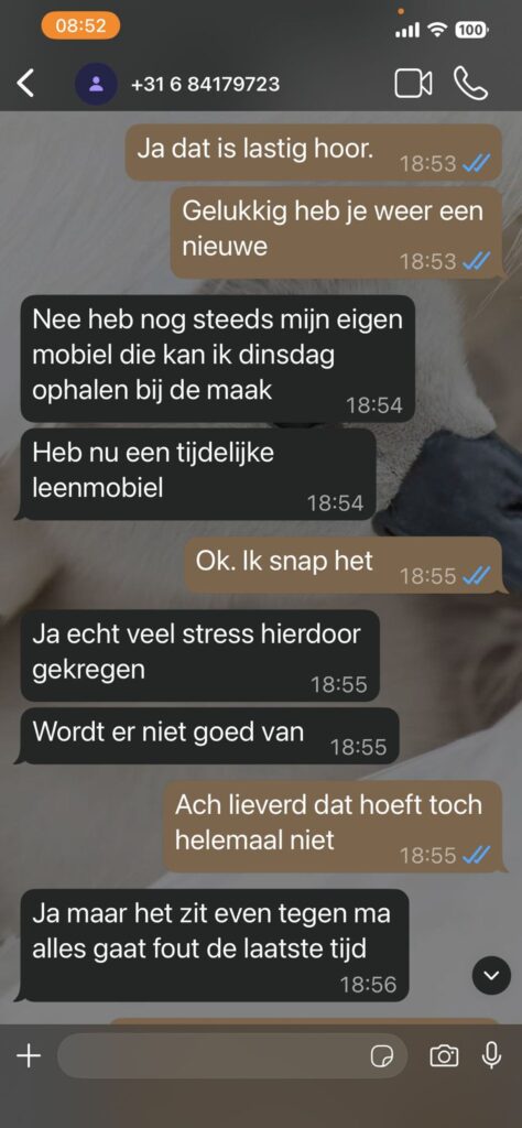 Een Whatsapp oplichter begint vaak met een herkenbaar script: een nieuw nummer, een kapotte telefoon en een zielig verhaal. In dit geval start het gesprek onschuldig met: “Hey ma, met mij wou je even melden dat ik op dit moment een nieuw nummer heb.” De ‘moeder’ reageert liefdevol en nietsvermoedend: “Top jongen. Fijn eindelijk weer wat van je te horen.” Precies dat warme contact is waar een Whatsapp oplichter op hoopt. Stap voor stap wordt de basis gelegd: stress, tegenslag en vooral emotie.